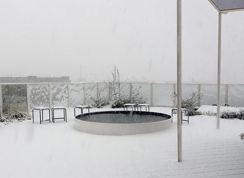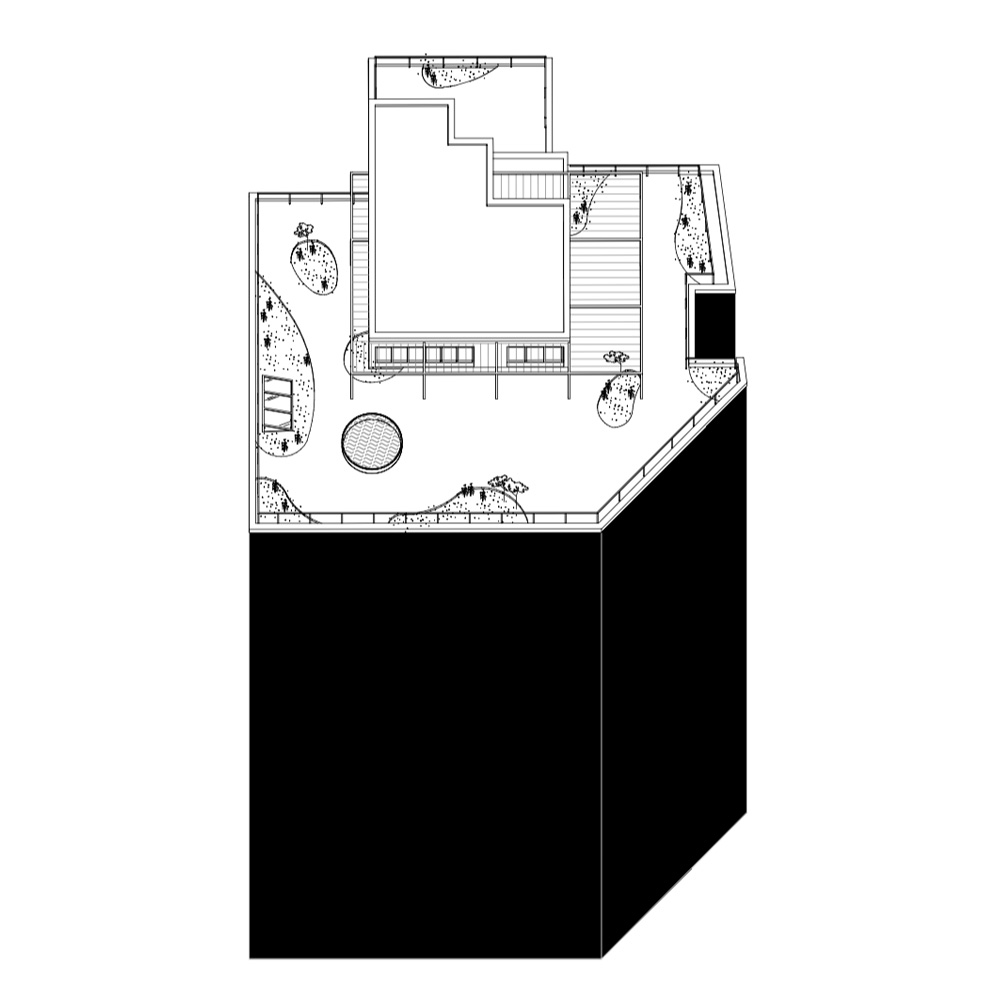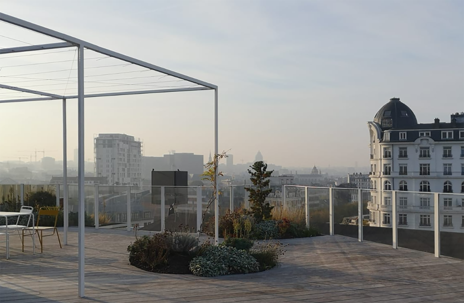 Rooftops are urban oases, spaces of spatial liberation where the city's complexity unfolds. They function as urban panopticons, offering views of the city without being seen. Roof Garden is a project on the 8th-floor penthouse of an old Art Deco building by the canal in Brussels. With a 360° view, its design follows Japanese tradition, using the metaphor of an archipelago: the flat roof is the sea, and objects or islands float freely on it. Plant trays shaped like domes subdivide the space, and a surrounding pergola creates a smooth transition between inside and outside. The plants, chosen for their resilience to wind and limited water, echo a desert garden.