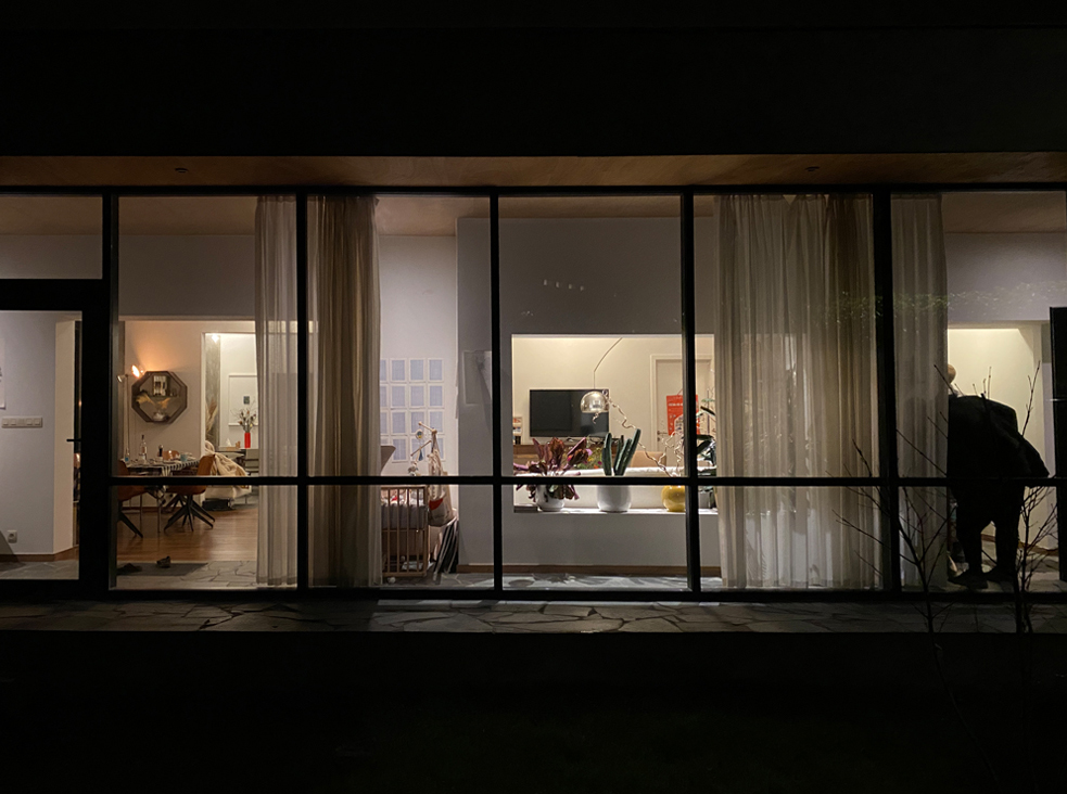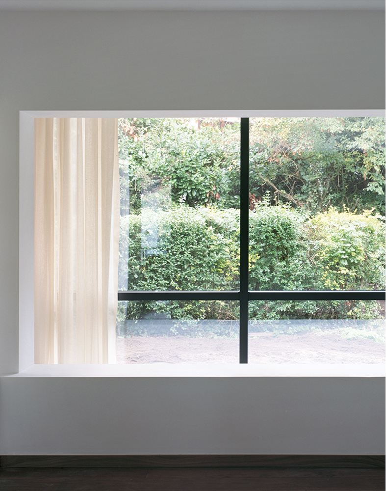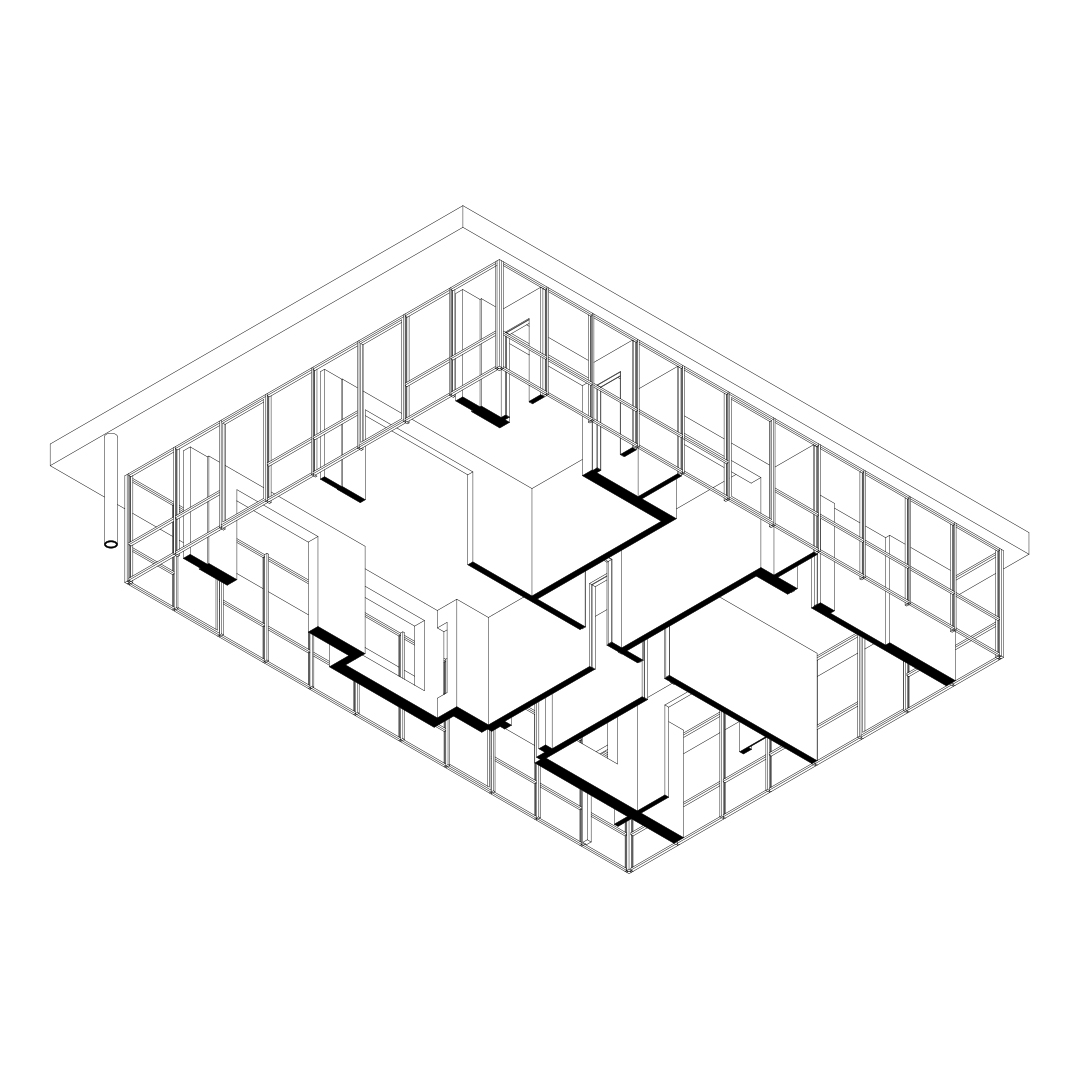 The project, situated in the periphery of Brussels, transforms a 60’s pitched roof red brick house by wrapping it with a new glass façade, a concrete plinth and a new flat roof. The new perimeter defined by the glass façade stands at an offset of 1m30 off the old walls creating an in-between space that houses the technical functions in order to free space for living rooms. The winter garden, bathrooms, toilets and washing machines are also placed in the in between space and serve as a filter from the garden to generate interstitial space that mediates between the garden and the core of the existing house.