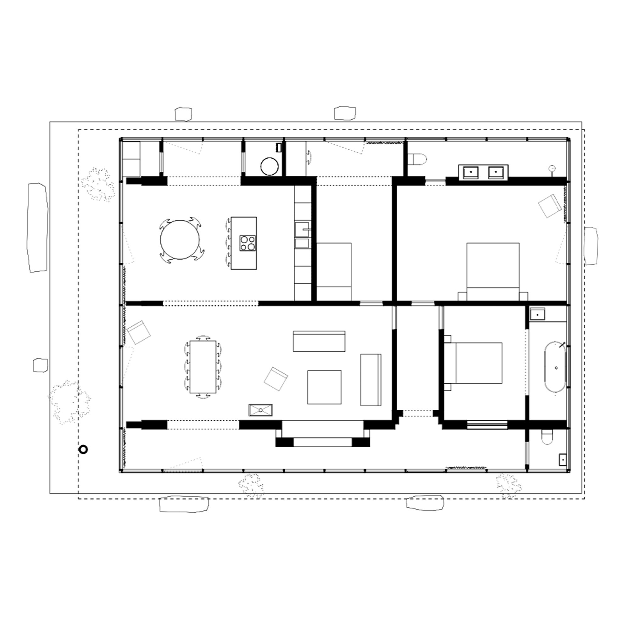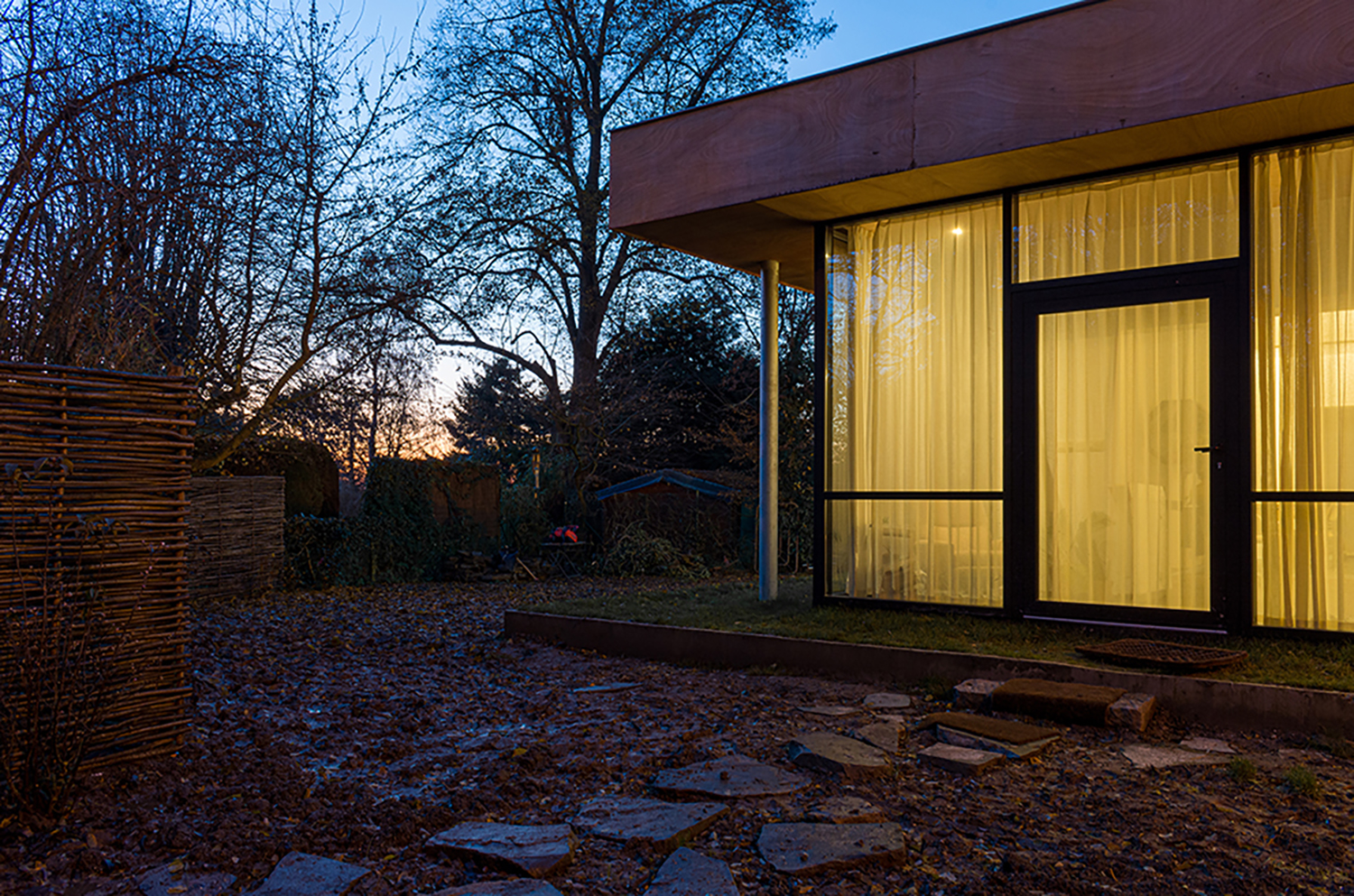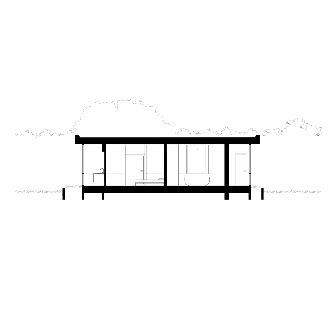 The project, situated in the periphery of Brussels, transforms a 60’s pitched roof red brick house by wrapping it with a new glass façade, a concrete plinth and a new flat roof. The new perimeter defined by the glass façade stands at an offset of 1m30 off the old walls creating an in-between space that houses the technical functions in order to free space for living rooms. The winter garden, bathrooms, toilets and washing machines are also placed in the in between space and serve as a filter from the garden to generate interstitial space that mediates between the garden and the core of the existing house.