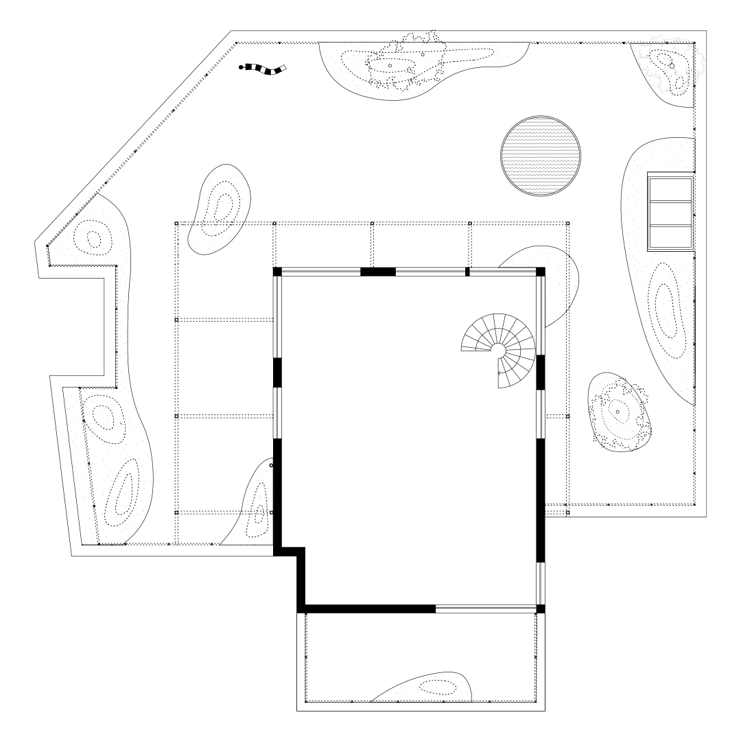 Rooftops are urban oases, spaces of spatial liberation where the city's complexity unfolds. They function as urban panopticons, offering views of the city without being seen. Roof Garden is a project on the 8th-floor penthouse of an old Art Deco building by the canal in Brussels. With a 360° view, its design follows Japanese tradition, using the metaphor of an archipelago: the flat roof is the sea, and objects or islands float freely on it. Plant trays shaped like domes subdivide the space, and a surrounding pergola creates a smooth transition between inside and outside. The plants, chosen for their resilience to wind and limited water, echo a desert garden.