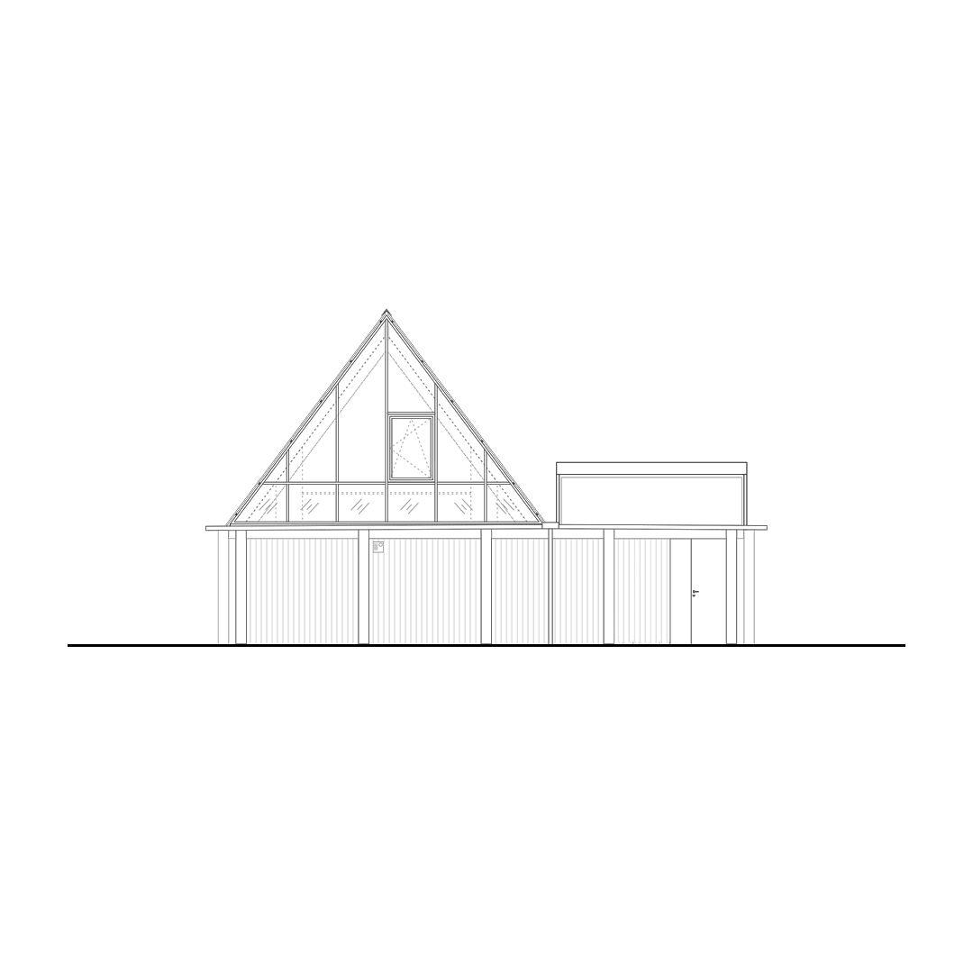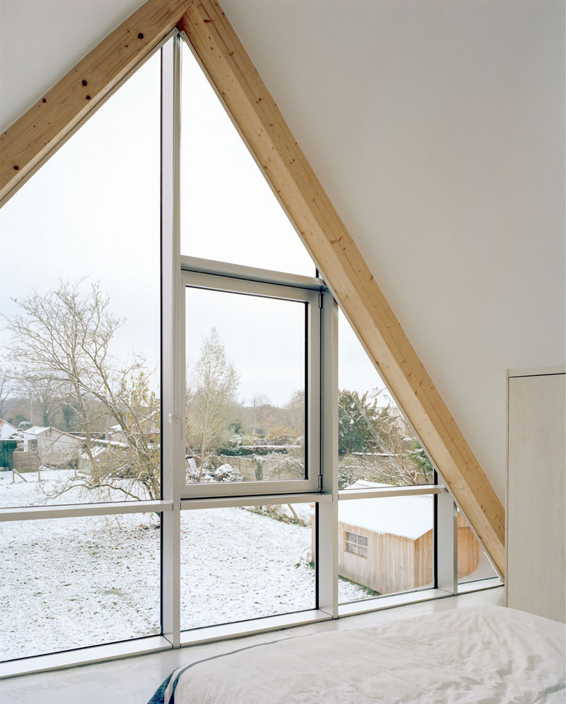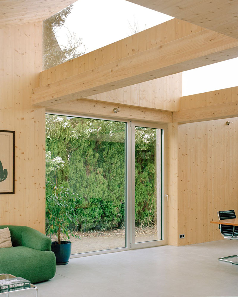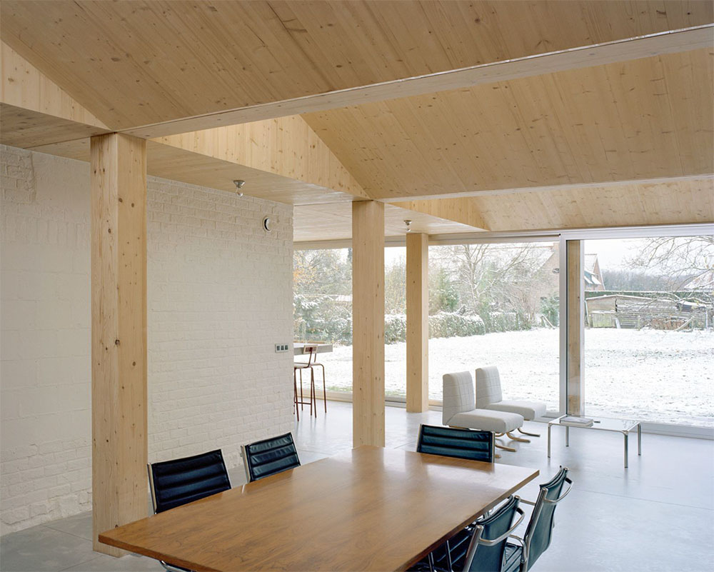 In the south of Brussels, an existing pitched-roof brick house is transformed by wrapping it in a new insulated wooden structure. The original house becomes the "night house," while a new grid of laminated wooden columns and beams forms the structure for the "day house." The north façade facing the street is blind on the ground floor, while the south façade, overlooking the garden, is fully glazed, allowing passive heating on sunny days. All horizontal floors are made of concrete, providing thermal inertia, while all vertical walls are constructed from wood. A shed-like photovoltaic roof covers the new extension, capturing solar energy and collecting rainwater for reuse.