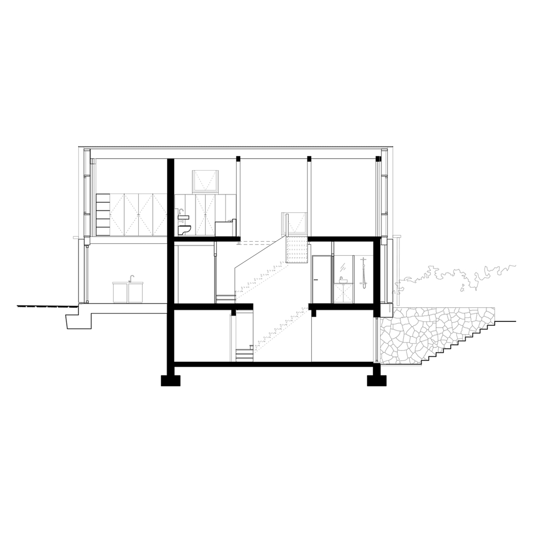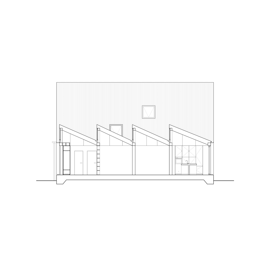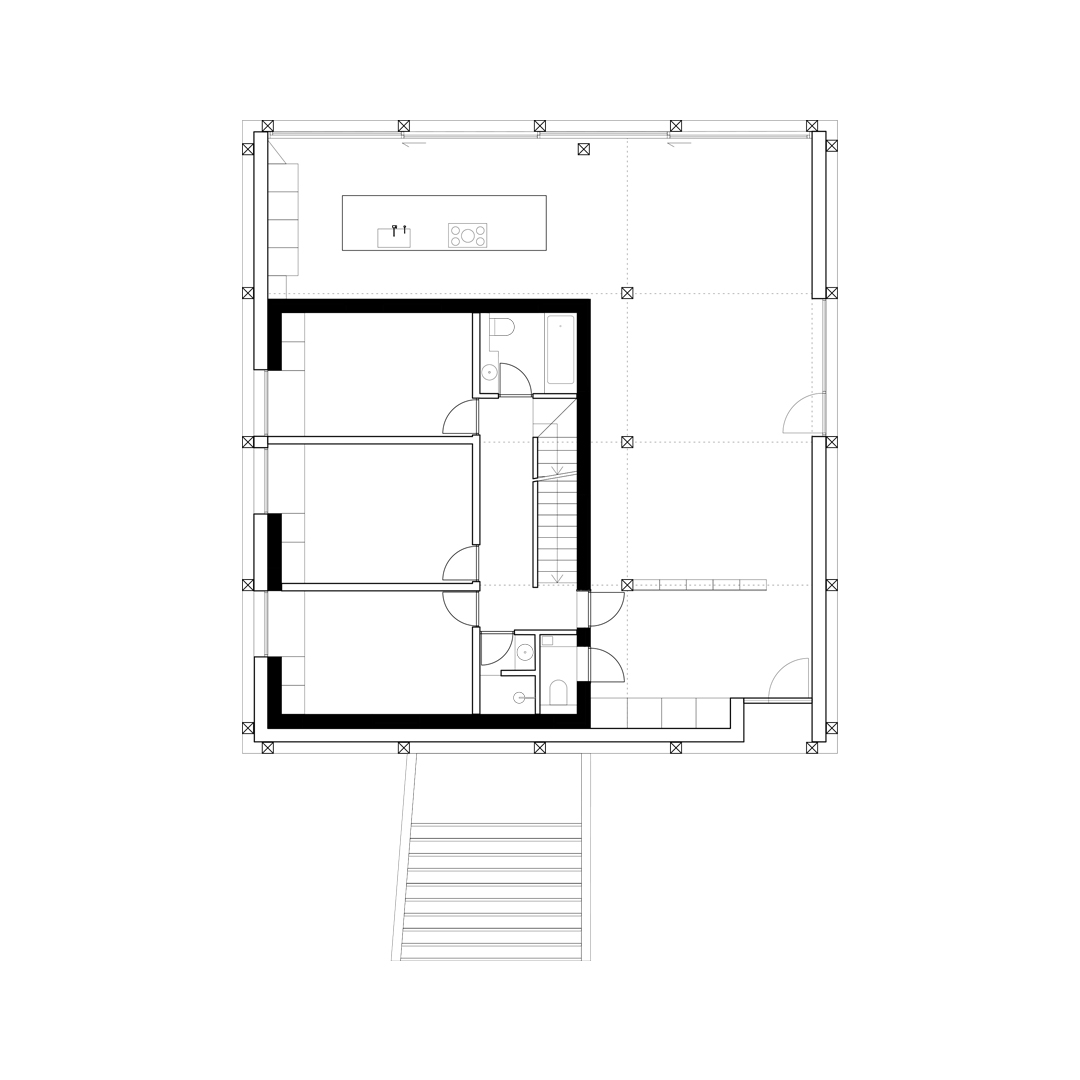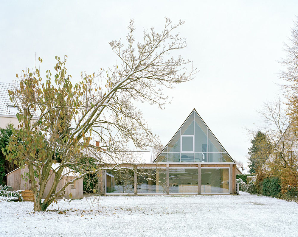 In the south of Brussels, an existing pitched-roof brick house is transformed by wrapping it in a new insulated wooden structure. The original house becomes the "night house," while a new grid of laminated wooden columns and beams forms the structure for the "day house." The north façade facing the street is blind on the ground floor, while the south façade, overlooking the garden, is fully glazed, allowing passive heating on sunny days. All horizontal floors are made of concrete, providing thermal inertia, while all vertical walls are constructed from wood. A shed-like photovoltaic roof covers the new extension, capturing solar energy and collecting rainwater for reuse.